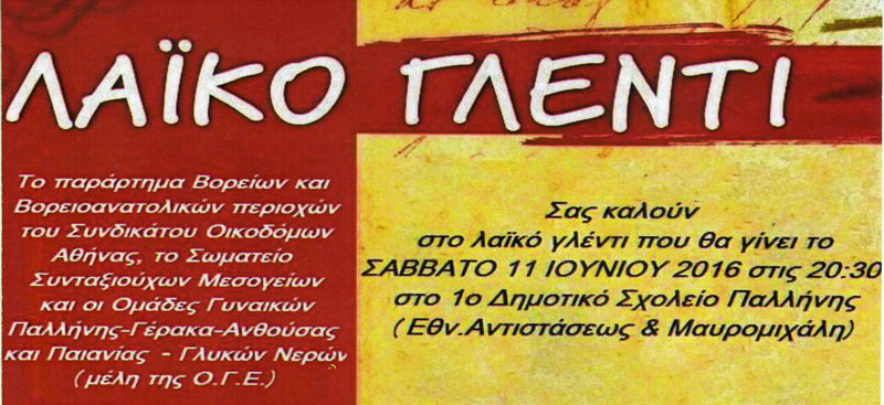 διοργανώνει λαϊκό γλέντι το Σάββατο 11 Ιουνίου 2016 στις 20.30, στο 1ο Δημοτικό Σχολείο Παλλήνης (Εθνικής Αντιστάσεως & Μαυρομιχάλη).