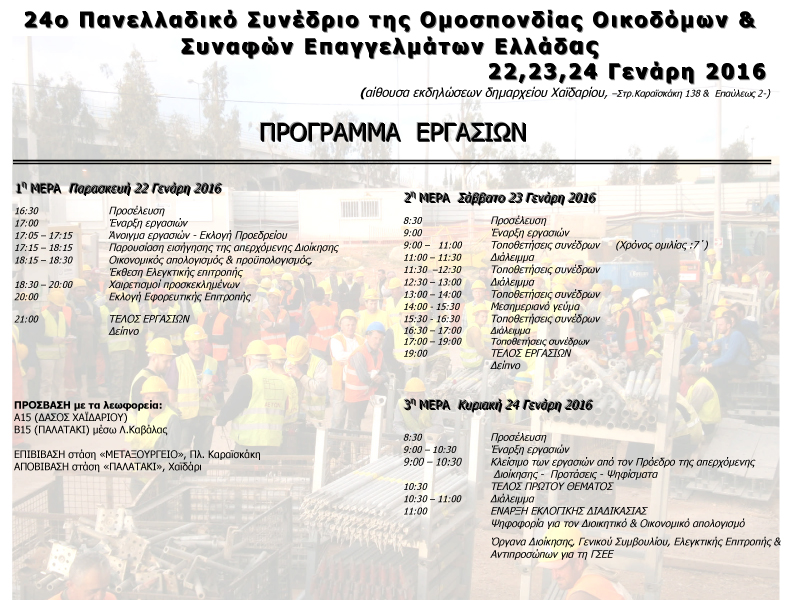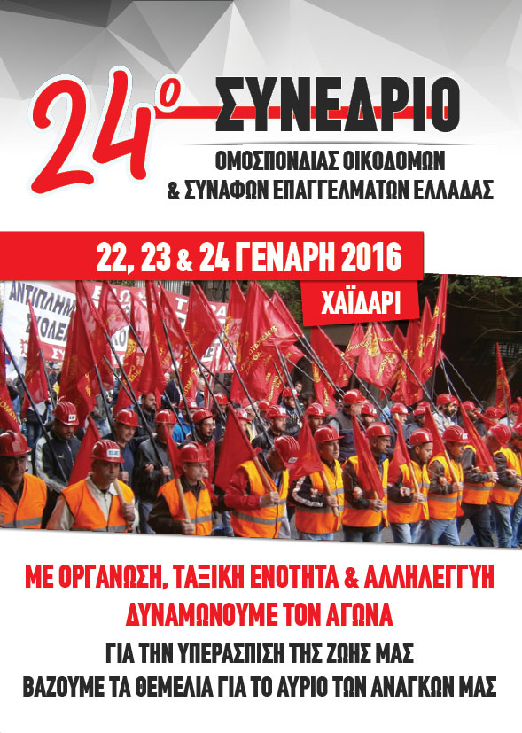 Σε συνθήκες γενικευμένης επίθεσης των δυνάμεων του κεφαλαίου, αλλά με όπλο τη πλούσια πείρα των αγώνων, σε όλες τις πτυχές της ζωής των εργατών και των λαϊκών στρωμάτων , πραγματοποιείτε το 24ο Συνέδριο της Ομοσπονδίας Οικοδόμων Ελλάδας στο Δημαρχείο Χαϊδαρίου 22-23-24 Γενάρη.